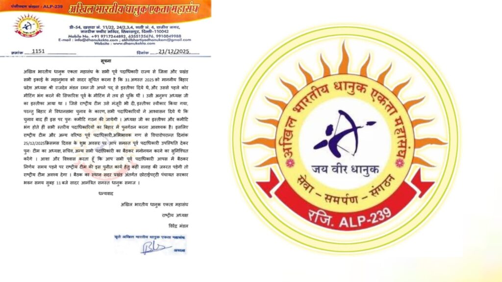 अखिल भारतीय धानुक एकता महासंघ (Akhil Bhartiya Dhanuk Ekta Mahasangh) की बिहार प्रदेश इकाई के पुनर्गठन को लेकर संगठन स्तर पर महत्वपूर्ण निर्णय लिया गया है। राष्ट्रीय अध्यक्ष विरेंद्र मंडल ने राज्य से लेकर जिला और प्रखंड स्तर तक के सभी पूर्व पदाधिकारियों को औपचारिक सूचना जारी करते हुए बताया कि बिहार प्रदेश कमेटी का पुनर्गठन अब आवश्यक हो गया है।