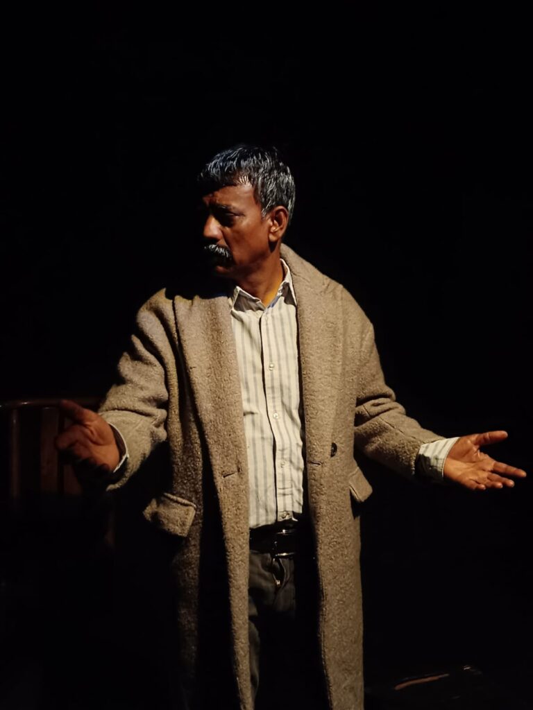 मंच पर राजेश राजा ने अपने सशक्त अभिनय से पात्र की अंतर्द्वंद्वपूर्ण मन:स्थिति को जीवंत कर दिया। प्रकाश परिकल्पना राजीव रॉय की रही, जिसने दृश्य संरचना को प्रभावी बनाया। पार्श्व ध्वनि का संयोजन राहुल आर्यन ने किया, जिससे भावनात्मक वातावरण और अधिक गहन हो उठा। रूप सज्जा आदिल रशीद और आदित्य ने संभाली, जबकि वस्त्र विन्यास पंकज कुमार द्वारा किया गया। मंच निर्माण की जिम्मेदारी सुनील जी ने निभाई। पूर्वाभ्यास प्रभारी के रूप में शशांक शेखर और अभिषेक मेहता का योगदान उल्लेखनीय रहा।
